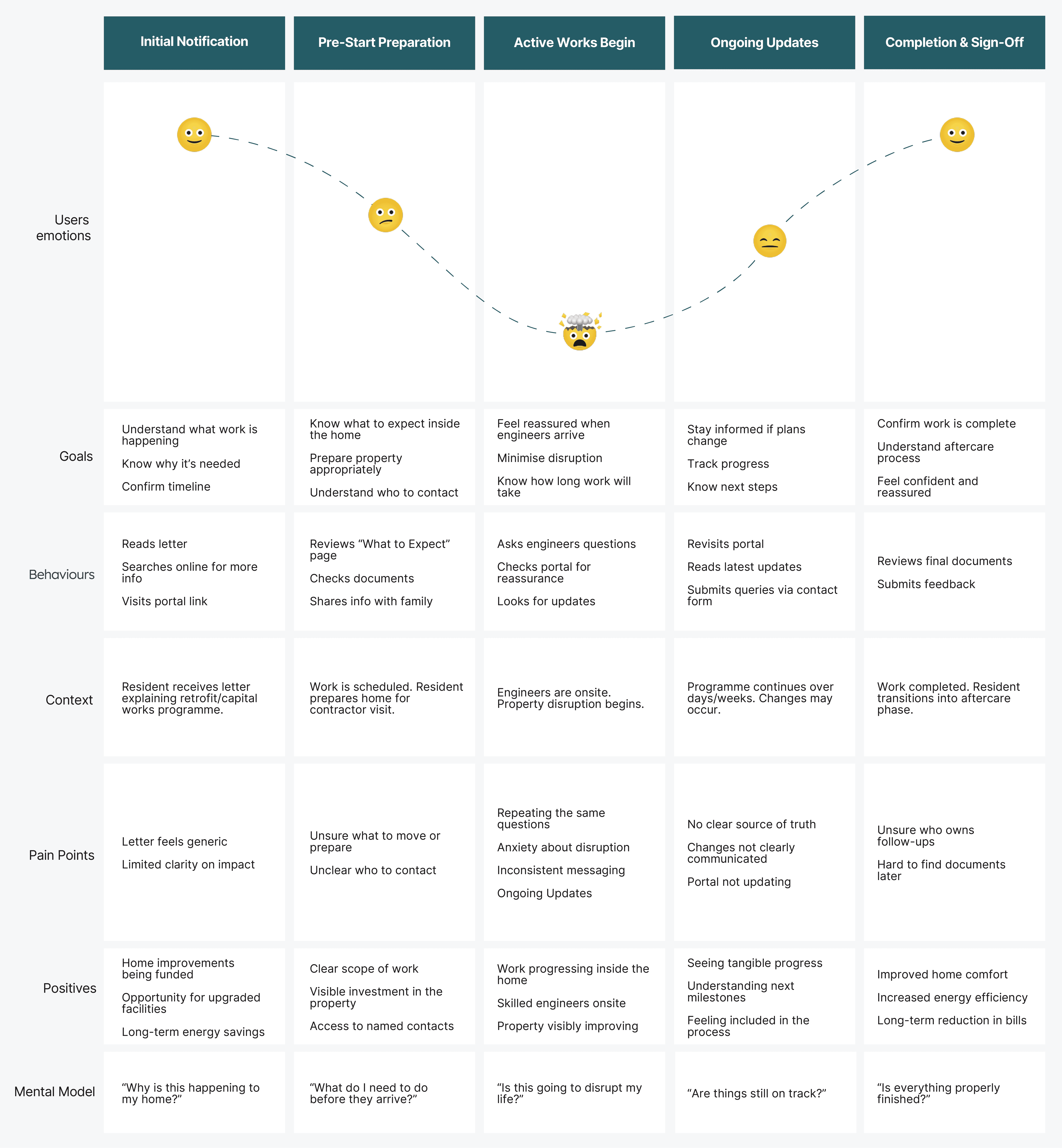 Features alone wouldn’t fix the problem unless they aligned to the real journey residents were experiencing during capital works and retrofit projects.
